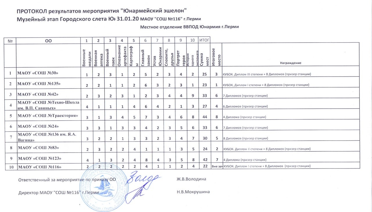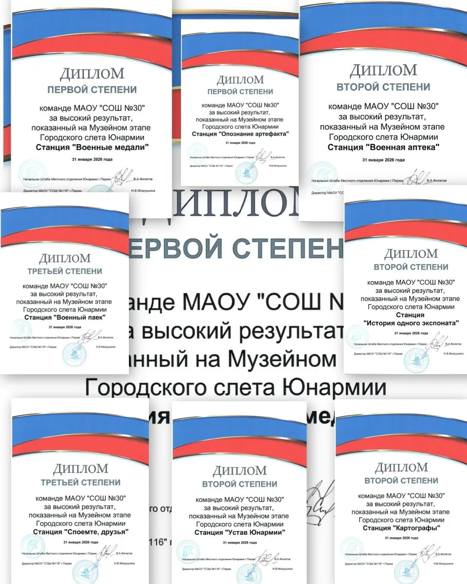 Команда юнармейцев отрядов МАОУ «СОШ №30» г. Перми «Хранители истории» и «Патриот» руководитель Андрей Викторович Андриянов, заняли почетное 3-е место. Ребята получили бронзовый кубок и диплом третьей степени.